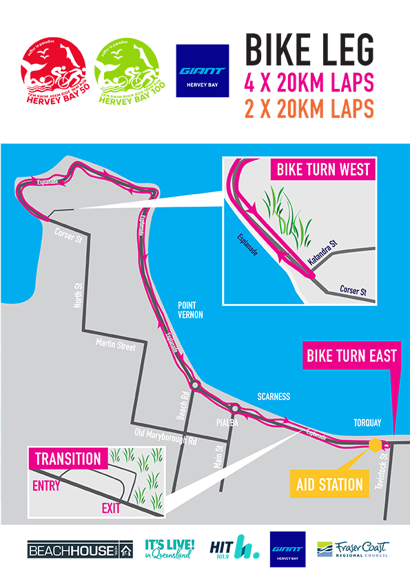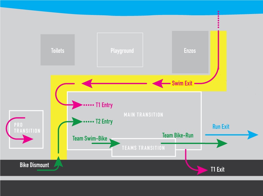 All aquabike competitors use the swim and ride, then run out of transition as marked following the run course, but taking a right u-turn up the finish chute about 200m into the run course